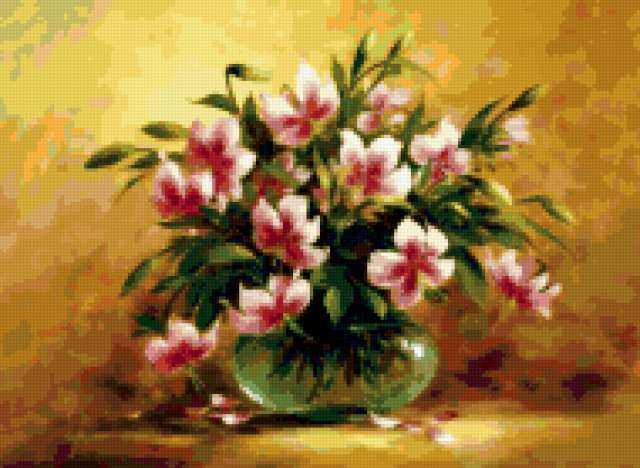 Ориентировочно так, схема вышивки «Букет», созданная автором jostinpowers, будет выглядеть при отшиве на канве. Размер данной вышивки равен 190x139 крестов, при этом используется 71 цветов. Ключевые слова, по которым можно найти эту схему: букет, цветы, ваза. Также, вы можете взглянуть на оригинальную картинку, соответствующую данной схеме вышивки.