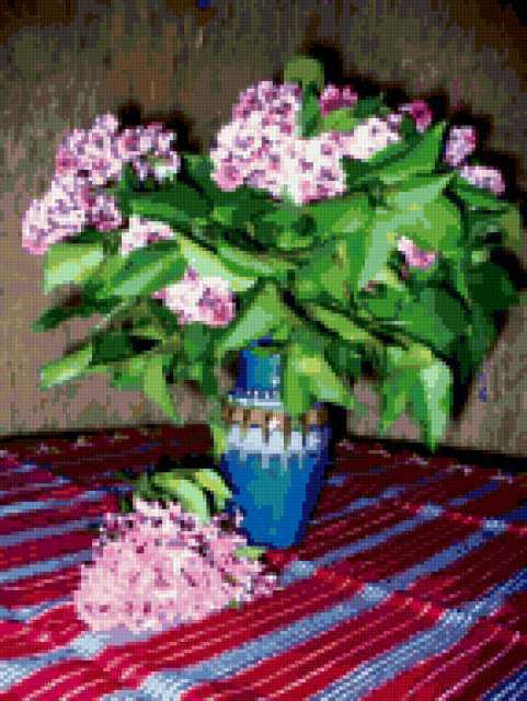Ориентировочно так, схема вышивки «Букет», созданная автором malkinaiv, будет выглядеть при отшиве на канве. Размер данной вышивки равен 143x190 крестов, при этом используется 77 цветов. Ключевые слова, по которым можно найти эту схему: цветы, букет, вазы. Также, вы можете взглянуть на оригинальную картинку, соответствующую данной схеме вышивки.