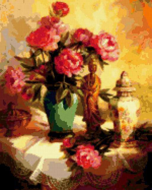 Ориентировочно так, схема вышивки «Букет», созданная автором milacha974, будет выглядеть при отшиве на канве. Размер данной вышивки равен 150x187 крестов, при этом используется 63 цветов. Ключевые слова, по которым можно найти эту схему: цветы, натюрморт. Также, вы можете взглянуть на оригинальную картинку, соответствующую данной схеме вышивки.