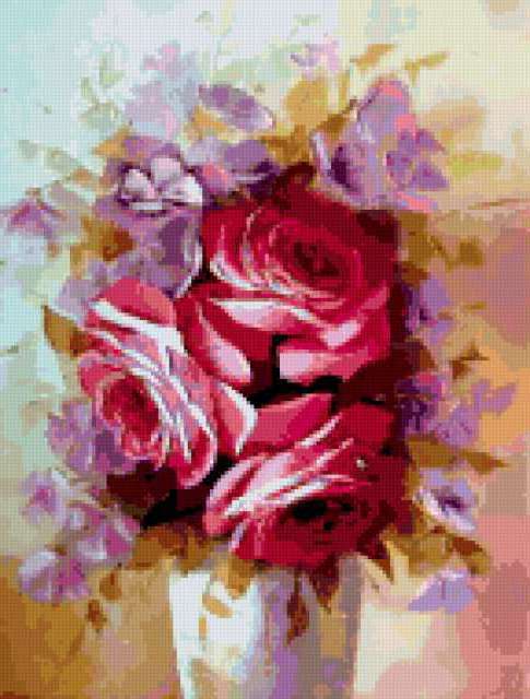 Ориентировочно так, схема вышивки «Букет», созданная автором xa00p3857, будет выглядеть при отшиве на канве. Размер данной вышивки равен 144x190 крестов, при этом используется 78 цветов. Ключевые слова, по которым можно найти эту схему: натюрморт, цветы, букет, ваза, розы. Также, вы можете взглянуть на оригинальную картинку, соответствующую данной схеме вышивки.
