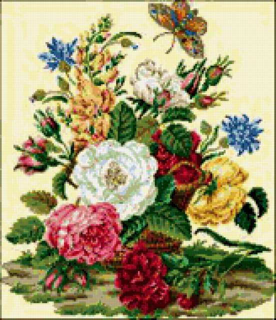 Ориентировочно так, схема вышивки «Букет», созданная автором rusosh, будет выглядеть при отшиве на канве. Размер данной вышивки равен 164x190 крестов, при этом используется 81 цветов. Ключевые слова, по которым можно найти эту схему: цветы в вазе, букет. Также, вы можете взглянуть на оригинальную картинку, соответствующую данной схеме вышивки.
