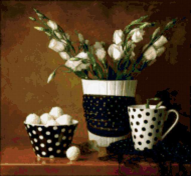 Ориентировочно так, схема вышивки «В горошек», созданная автором MamaKsu13, будет выглядеть при отшиве на канве. Размер данной вышивки равен 190x176 крестов, при этом используется 60 цветов. Ключевые слова, по которым можно найти эту схему: кухня, цветы. Также, вы можете взглянуть на оригинальную картинку, соответствующую данной схеме вышивки.