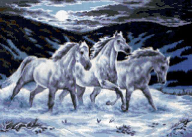 Ориентировочно так, схема вышивки «В лунном свете», созданная автором VA903M, будет выглядеть при отшиве на канве. Размер данной вышивки равен 190x136 крестов, при этом используется 44 цветов. Ключевые слова, по которым можно найти эту схему: лошади, кони, луна, ночь, тройка. Также, вы можете взглянуть на оригинальную картинку, соответствующую данной схеме вышивки.