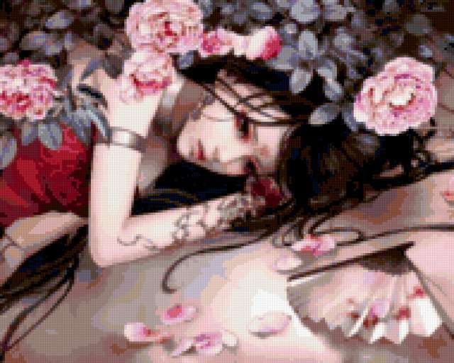 Ориентировочно так, схема вышивки «В цветах», созданная автором a_ahuli, будет выглядеть при отшиве на канве. Размер данной вышивки равен 190x152 крестов, при этом используется 63 цветов. Ключевые слова, по которым можно найти эту схему: девушка, цветы, японка, веер. Также, вы можете взглянуть на оригинальную картинку, соответствующую данной схеме вышивки.