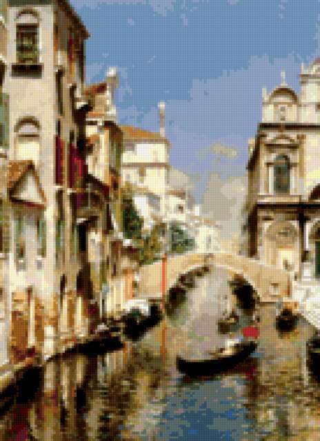 Ориентировочно так, схема вышивки «Венеция», созданная автором cluster, будет выглядеть при отшиве на канве. Размер данной вышивки равен 138x190 крестов, при этом используется 74 цветов. Ключевые слова, по которым можно найти эту схему: город, улица. Также, вы можете взглянуть на оригинальную картинку, соответствующую данной схеме вышивки.