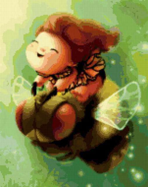 Ориентировочно так, схема вышивки «Верхом на пчеле», созданная автором avevstigneeva, будет выглядеть при отшиве на канве. Размер данной вышивки равен 151x190 крестов, при этом используется 58 цветов. Ключевые слова, по которым можно найти эту схему: сказка, детям, юмор. Также, вы можете взглянуть на оригинальную картинку, соответствующую данной схеме вышивки.