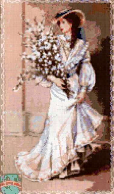 Ориентировочно так, схема вышивки «Весенние цветы», созданная автором poltanya, будет выглядеть при отшиве на канве. Размер данной вышивки равен 112x190 крестов, при этом используется 25 цветов. Ключевые слова, по которым можно найти эту схему: весенние цветы, прекрасные женщины, женщина, девушка, портрет, картина, букет, весна, дама, шляпка, красавица, ретро. Также, вы можете взглянуть на оригинальную картинку, соответствующую данной схеме вышивки.