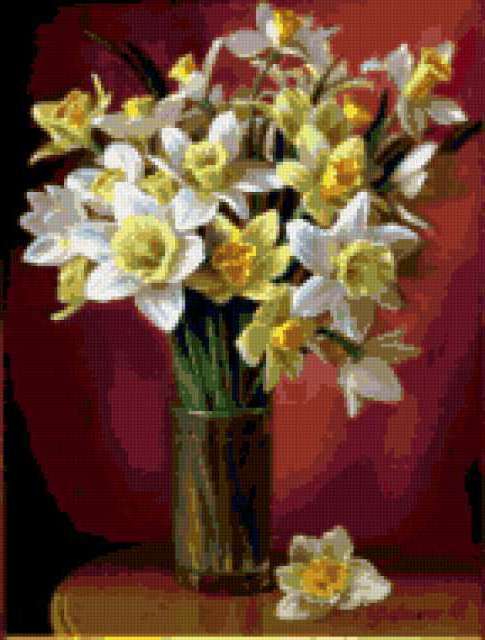 Ориентировочно так, схема вышивки «Весенние цветы», созданная автором VA903M, будет выглядеть при отшиве на канве. Размер данной вышивки равен 144x190 крестов, при этом используется 55 цветов. Ключевые слова, по которым можно найти эту схему: нарцыс, цветы, букет. Также, вы можете взглянуть на оригинальную картинку, соответствующую данной схеме вышивки.