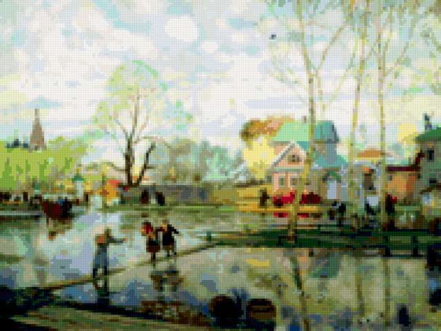 Ориентировочно так, схема вышивки «Весна в городке», созданная автором Aliko, будет выглядеть при отшиве на канве. Размер данной вышивки равен 190x143 крестов, при этом используется 79 цветов. Ключевые слова, по которым можно найти эту схему: весна, город, пейзаж. Также, вы можете взглянуть на оригинальную картинку, соответствующую данной схеме вышивки.