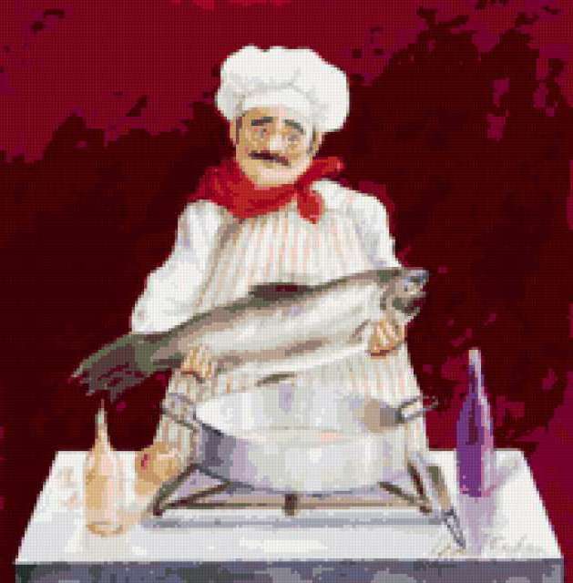 Ориентировочно так, схема вышивки «Весёлый повар», созданная автором poltanya, будет выглядеть при отшиве на канве. Размер данной вышивки равен 187x190 крестов, при этом используется 37 цветов. Ключевые слова, по которым можно найти эту схему: кухня, панно, украшения для кухни, весёлый повар, повар, картина, пища. Также, вы можете взглянуть на оригинальную картинку, соответствующую данной схеме вышивки.