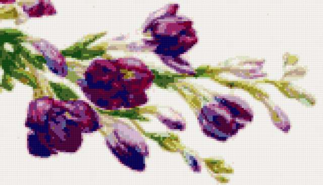 Ориентировочно так, схема вышивки «Веточка фрезий», созданная автором poltanya, будет выглядеть при отшиве на канве. Размер данной вышивки равен 167x96 крестов, при этом используется 26 цветов. Ключевые слова, по которым можно найти эту схему: цветы, панно, цветочное панно, фрезии, букет, флора, нежные лепестки. Также, вы можете взглянуть на оригинальную картинку, соответствующую данной схеме вышивки.