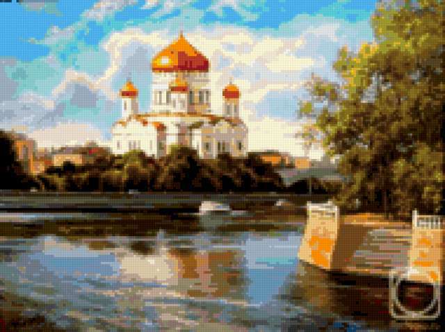 Ориентировочно так, схема вышивки «Вид на храм», созданная автором VA903M, будет выглядеть при отшиве на канве. Размер данной вышивки равен 190x142 крестов, при этом используется 73 цветов. Ключевые слова, по которым можно найти эту схему: церковь, храм, пейзаж. Также, вы можете взглянуть на оригинальную картинку, соответствующую данной схеме вышивки.