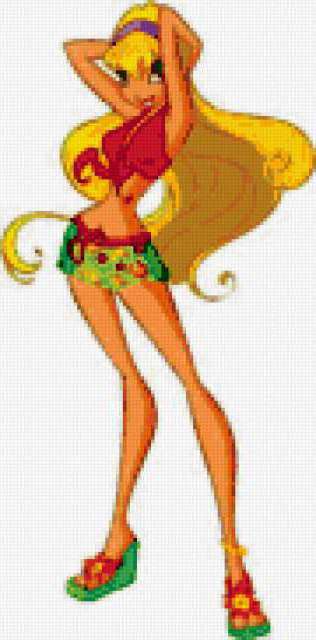 Ориентировочно так, схема вышивки «Винкс», созданная автором savva_25, будет выглядеть при отшиве на канве. Размер данной вышивки равен 90x182 крестов, при этом используется 49 цветов. Ключевые слова, по которым можно найти эту схему: мульт. Также, вы можете взглянуть на оригинальную картинку, соответствующую данной схеме вышивки.