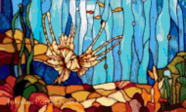 Ориентировочно так, схема вышивки «Витраж», созданная автором dect81, будет выглядеть при отшиве на канве. Размер данной вышивки равен 190x115 крестов, при этом используется 77 цветов. Ключевые слова, по которым можно найти эту схему: Витраж, картина. Также, вы можете взглянуть на оригинальную картинку, соответствующую данной схеме вышивки.