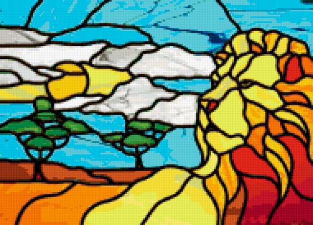 Ориентировочно так, схема вышивки «Витраж», созданная автором dect81, будет выглядеть при отшиве на канве. Размер данной вышивки равен 190x137 крестов, при этом используется 65 цветов. Ключевые слова, по которым можно найти эту схему: Витраж. Также, вы можете взглянуть на оригинальную картинку, соответствующую данной схеме вышивки.