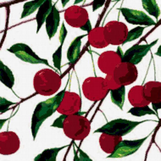 Ориентировочно так, схема вышивки «Вишня», созданная автором Eddy, будет выглядеть при отшиве на канве. Размер данной вышивки равен 190x190 крестов, при этом используется 40 цветов. Ключевые слова, по которым можно найти эту схему: кухня, картина, подушка, ягода, вишня. Также, вы можете взглянуть на оригинальную картинку, соответствующую данной схеме вышивки.