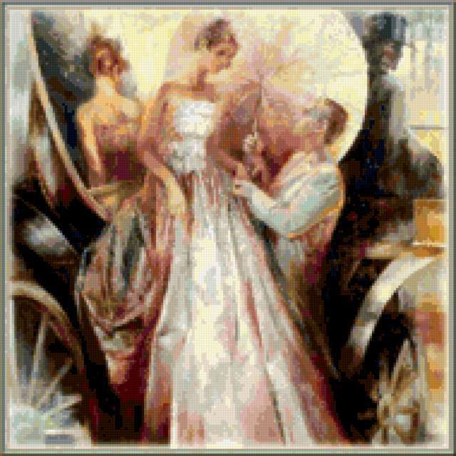 Ориентировочно так, схема вышивки «Влюбленные», созданная автором vesnyshka63, будет выглядеть при отшиве на канве. Размер данной вышивки равен 190x190 крестов, при этом используется 84 цветов. Ключевые слова, по которым можно найти эту схему: пара, романтика, любовь. Также, вы можете взглянуть на оригинальную картинку, соответствующую данной схеме вышивки.