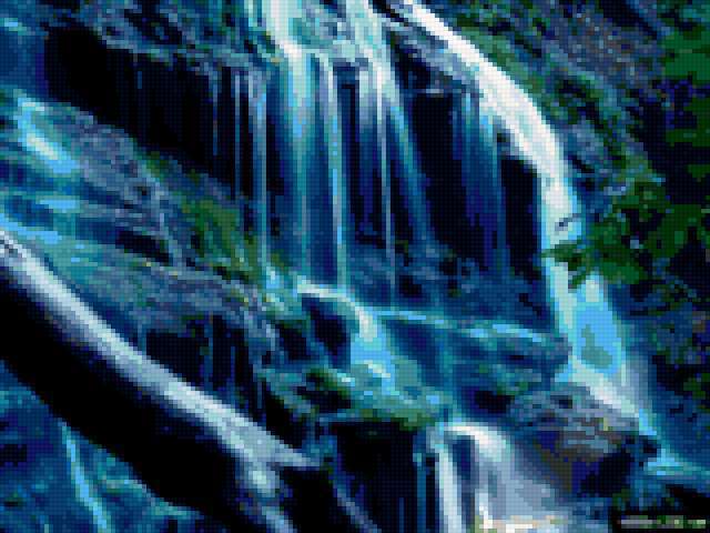 Ориентировочно так, схема вышивки «Водопад», созданная автором krisone, будет выглядеть при отшиве на канве. Размер данной вышивки равен 160x120 крестов, при этом используется 52 цветов. К несчастью, автор не назначил для схемы ключевые слова. Также, вы можете взглянуть на оригинальную картинку, соответствующую данной схеме вышивки.
