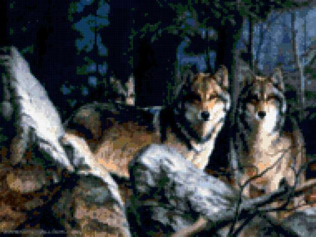 Ориентировочно так, схема вышивки «Волки», созданная автором Luda49, будет выглядеть при отшиве на канве. Размер данной вышивки равен 190x143 крестов, при этом используется 58 цветов. К несчастью, автор не назначил для схемы ключевые слова. Также, вы можете взглянуть на оригинальную картинку, соответствующую данной схеме вышивки.