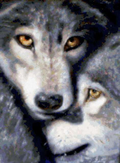 Ориентировочно так, схема вышивки «Волки», созданная автором SOVA187, будет выглядеть при отшиве на канве. Размер данной вышивки равен 140x190 крестов, при этом используется 58 цветов. Ключевые слова, по которым можно найти эту схему: пара, он иона, любовь, волки. Также, вы можете взглянуть на оригинальную картинку, соответствующую данной схеме вышивки.