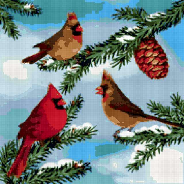 Ориентировочно так, схема вышивки «Времена года», созданная автором poltanya, будет выглядеть при отшиве на канве. Размер данной вышивки равен 190x190 крестов, при этом используется 38 цветов. Ключевые слова, по которым можно найти эту схему: птицы, времена года, природа, птички, птичка, картина, красота, райские птички, кардинал, зима, шишка, ёлка. Также, вы можете взглянуть на оригинальную картинку, соответствующую данной схеме вышивки.