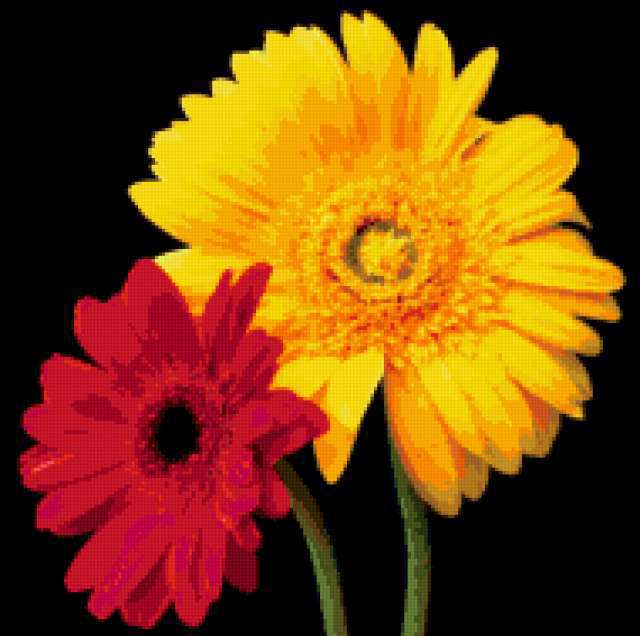 Ориентировочно так, схема вышивки «Герберы», созданная автором palena29, будет выглядеть при отшиве на канве. Размер данной вышивки равен 190x189 крестов, при этом используется 38 цветов. Ключевые слова, по которым можно найти эту схему: флора, цветы. Также, вы можете взглянуть на оригинальную картинку, соответствующую данной схеме вышивки.
