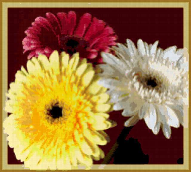 Ориентировочно так, схема вышивки «Герберы», созданная автором malkinaiv, будет выглядеть при отшиве на канве. Размер данной вышивки равен 190x171 крестов, при этом используется 59 цветов. Ключевые слова, по которым можно найти эту схему: цветы, герберы. Также, вы можете взглянуть на оригинальную картинку, соответствующую данной схеме вышивки.
