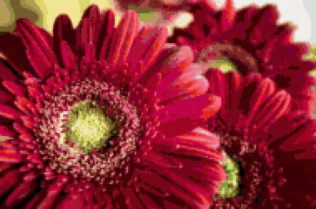 Ориентировочно так, схема вышивки «Герберы», созданная автором IriskaDDS, будет выглядеть при отшиве на канве. Размер данной вышивки равен 190x126 крестов, при этом используется 39 цветов. Ключевые слова, по которым можно найти эту схему: герберы, цветы. Также, вы можете взглянуть на оригинальную картинку, соответствующую данной схеме вышивки.