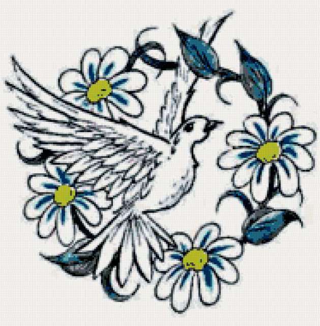 Ориентировочно так, схема вышивки «Голубка», созданная автором alena4, будет выглядеть при отшиве на канве. Размер данной вышивки равен 187x190 крестов, при этом используется 29 цветов. Ключевые слова, по которым можно найти эту схему: голубка, голубь, голуби, птицы, любовь, птица, цветы, цветок, ромашка, ромашки. Также, вы можете взглянуть на оригинальную картинку, соответствующую данной схеме вышивки.