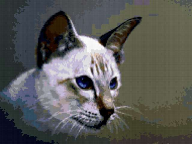 Ориентировочно так, схема вышивки «Голубоглазый», созданная автором irenidanna, будет выглядеть при отшиве на канве. Размер данной вышивки равен 190x143 крестов, при этом используется 35 цветов. Ключевые слова, по которым можно найти эту схему: кошка. Также, вы можете взглянуть на оригинальную картинку, соответствующую данной схеме вышивки.