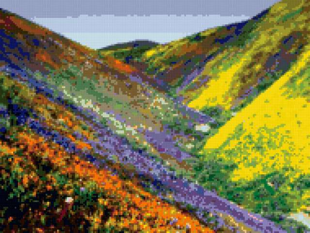 Ориентировочно так, схема вышивки «Горы», созданная автором anaferon, будет выглядеть при отшиве на канве. Размер данной вышивки равен 190x143 крестов, при этом используется 48 цветов. Ключевые слова, по которым можно найти эту схему: пейзаж, природа, горы, цветы. Также, вы можете взглянуть на оригинальную картинку, соответствующую данной схеме вышивки.