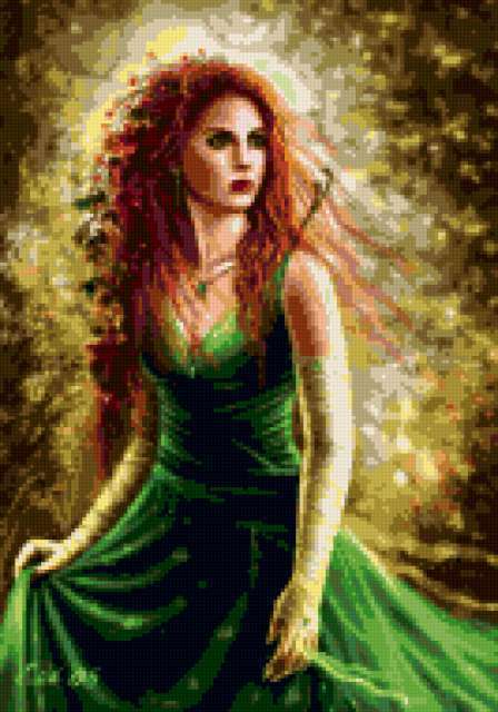 Ориентировочно так, схема вышивки «Дама в зеленом», созданная автором zaihik, будет выглядеть при отшиве на канве. Размер данной вышивки равен 133x190 крестов, при этом используется 42 цветов. Ключевые слова, по которым можно найти эту схему: девушка, люди. Также, вы можете взглянуть на оригинальную картинку, соответствующую данной схеме вышивки.
