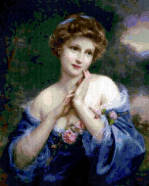 Ориентировочно так, схема вышивки «Дама в синем», созданная автором VA903M, будет выглядеть при отшиве на канве. Размер данной вышивки равен 152x190 крестов, при этом используется 68 цветов. Ключевые слова, по которым можно найти эту схему: дама, живопись, картина, портрет. Также, вы можете взглянуть на оригинальную картинку, соответствующую данной схеме вышивки.