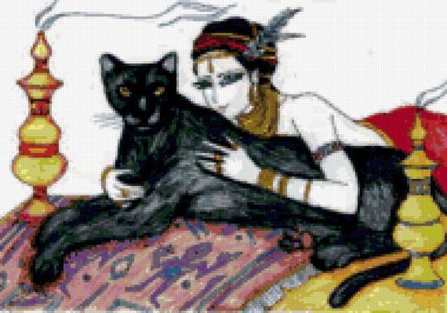 Ориентировочно так, схема вышивки «Дама с кошкой», созданная автором VA903M, будет выглядеть при отшиве на канве. Размер данной вышивки равен 190x133 крестов, при этом используется 55 цветов. Ключевые слова, по которым можно найти эту схему: пантера, дама, восток, восточная красавица. Также, вы можете взглянуть на оригинальную картинку, соответствующую данной схеме вышивки.