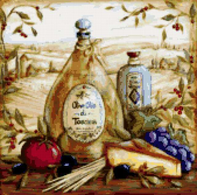 Ориентировочно так, схема вышивки «Дары Италии», созданная автором poltanya, будет выглядеть при отшиве на канве. Размер данной вышивки равен 169x167 крестов, при этом используется 51 цветов. Ключевые слова, по которым можно найти эту схему: италия, тоскания, помидор, масло, оливки, природа, виноград, для кухни, украшения для кухни, панно, красота. Также, вы можете взглянуть на оригинальную картинку, соответствующую данной схеме вышивки.