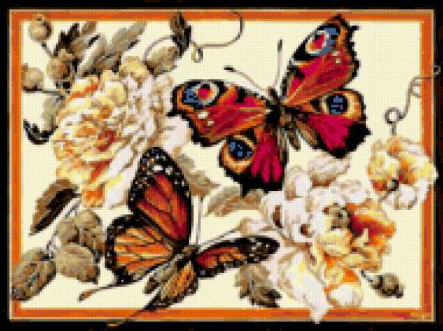 Ориентировочно так, схема вышивки «Две бабочки и пионы», созданная автором smetanochka0106, будет выглядеть при отшиве на канве. Размер данной вышивки равен 190x142 крестов, при этом используется 79 цветов. Ключевые слова, по которым можно найти эту схему: бабочки. Также, вы можете взглянуть на оригинальную картинку, соответствующую данной схеме вышивки.