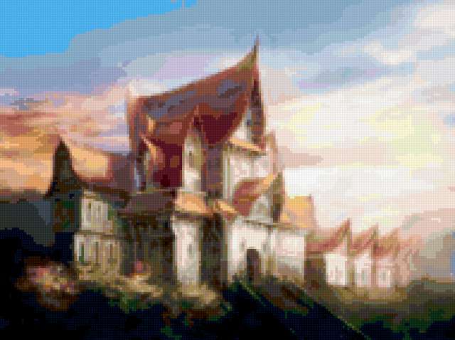 Ориентировочно так, схема вышивки «Дворец», созданная автором Nastasi6, будет выглядеть при отшиве на канве. Размер данной вышивки равен 190x142 крестов, при этом используется 78 цветов. Ключевые слова, по которым можно найти эту схему: природа, пейзаж, дворец, картина. Также, вы можете взглянуть на оригинальную картинку, соответствующую данной схеме вышивки.