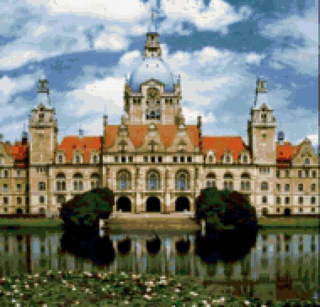 Ориентировочно так, схема вышивки «Дворец», созданная автором VA903M, будет выглядеть при отшиве на канве. Размер данной вышивки равен 190x182 крестов, при этом используется 75 цветов. Ключевые слова, по которым можно найти эту схему: замок, дворец. Также, вы можете взглянуть на оригинальную картинку, соответствующую данной схеме вышивки.