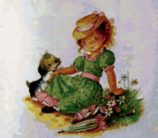 Ориентировочно так, схема вышивки «Девочка с собачкой», созданная автором akylina72, будет выглядеть при отшиве на канве. Размер данной вышивки равен 190x166 крестов, при этом используется 58 цветов. Ключевые слова, по которым можно найти эту схему: дети, ретро, картина, люди, девочка. Также, вы можете взглянуть на оригинальную картинку, соответствующую данной схеме вышивки.