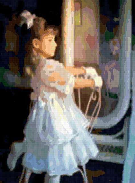 Ориентировочно так, схема вышивки «Девочка у зеркала», созданная автором marusya84, будет выглядеть при отшиве на канве. Размер данной вышивки равен 135x182 крестов, при этом используется 67 цветов. Ключевые слова, по которым можно найти эту схему: дети, ребенок, девочка. Также, вы можете взглянуть на оригинальную картинку, соответствующую данной схеме вышивки.