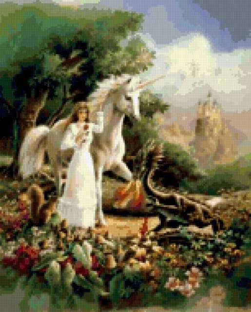 Ориентировочно так, схема вышивки «Девушка и единорог», созданная автором antinona, будет выглядеть при отшиве на канве. Размер данной вышивки равен 153x190 крестов, при этом используется 84 цветов. Ключевые слова, по которым можно найти эту схему: фэнтези, девушка, весна. Также, вы можете взглянуть на оригинальную картинку, соответствующую данной схеме вышивки.