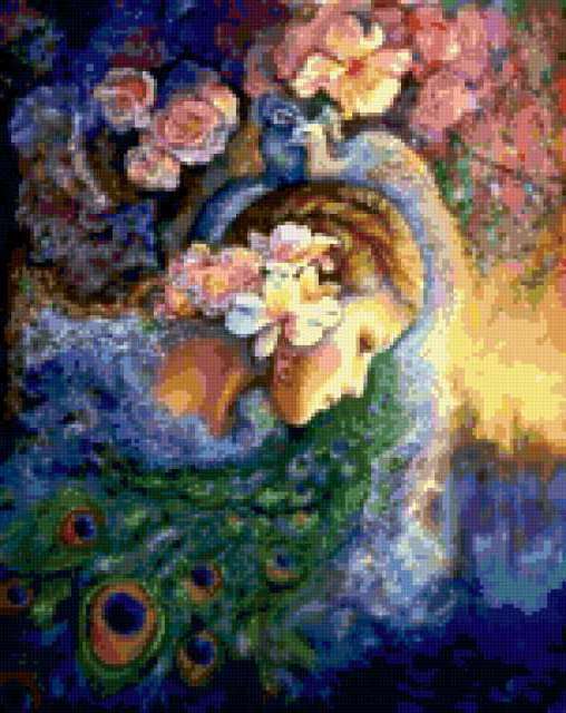 Ориентировочно так, схема вышивки «Девушка и павлин», созданная автором 13197, будет выглядеть при отшиве на канве. Размер данной вышивки равен 151x190 крестов, при этом используется 78 цветов. Ключевые слова, по которым можно найти эту схему: люди, птицы, фэнтези. Также, вы можете взглянуть на оригинальную картинку, соответствующую данной схеме вышивки.