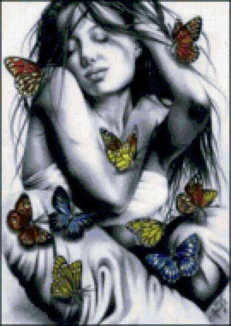 Ориентировочно так, схема вышивки «Девушка с бабочками», созданная автором avevstigneeva, будет выглядеть при отшиве на канве. Размер данной вышивки равен 135x190 крестов, при этом используется 69 цветов. Ключевые слова, по которым можно найти эту схему: графика, живопись, девушка, бабочки. Также, вы можете взглянуть на оригинальную картинку, соответствующую данной схеме вышивки.