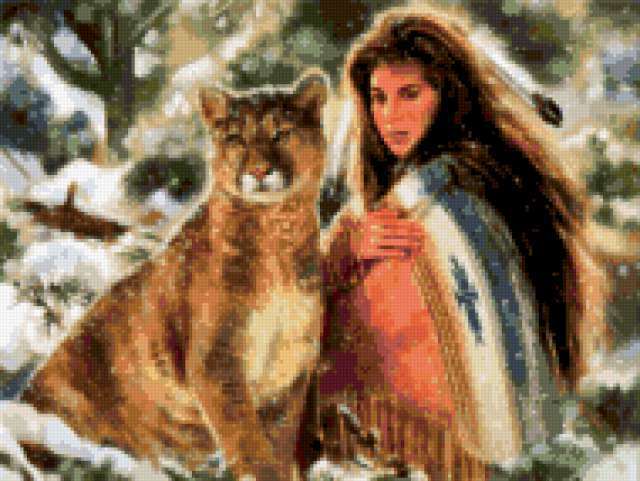Ориентировочно так, схема вышивки «Девушка», созданная автором allllla, будет выглядеть при отшиве на канве. Размер данной вышивки равен 190x143 крестов, при этом используется 74 цветов. Ключевые слова, по которым можно найти эту схему: она, индейка, девушка, хищники, кошки, девушки, портрет, женские образы, картина. Также, вы можете взглянуть на оригинальную картинку, соответствующую данной схеме вышивки.
