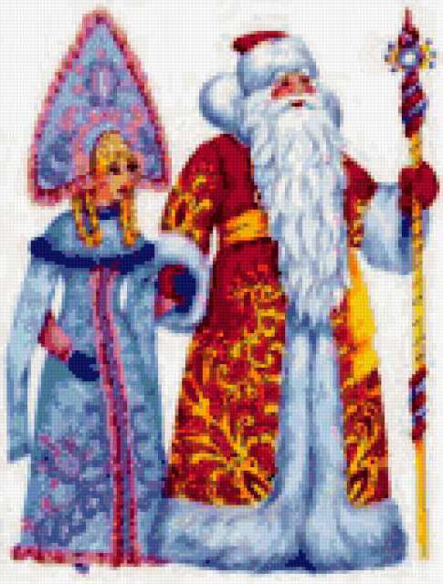 Ориентировочно так, схема вышивки «Дед мороз и снегурочка», созданная автором masyaska23, будет выглядеть при отшиве на канве. Размер данной вышивки равен 129x170 крестов, при этом используется 75 цветов. Ключевые слова, по которым можно найти эту схему: новый год. Также, вы можете взглянуть на оригинальную картинку, соответствующую данной схеме вышивки.