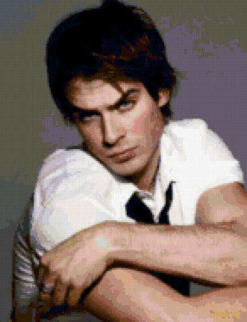 Ориентировочно так, схема вышивки «Деймон», созданная автором natalianet2012, будет выглядеть при отшиве на канве. Размер данной вышивки равен 146x190 крестов, при этом используется 57 цветов. Ключевые слова, по которым можно найти эту схему: дневники вампира, деймон, иен. Также, вы можете взглянуть на оригинальную картинку, соответствующую данной схеме вышивки.