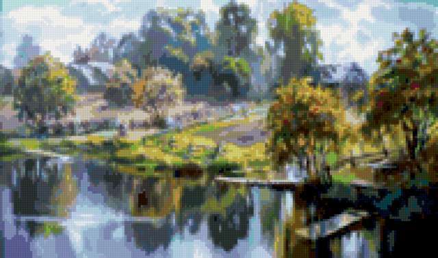 Ориентировочно так, схема вышивки «Деревенская идилия», созданная автором rybka6, будет выглядеть при отшиве на канве. Размер данной вышивки равен 190x112 крестов, при этом используется 72 цветов. Ключевые слова, по которым можно найти эту схему: лето, деревня, домики, пруд, река, отражение, мостки, мостик, тишина, пейзаж, искусство, живопись, картина. Также, вы можете взглянуть на оригинальную картинку, соответствующую данной схеме вышивки.