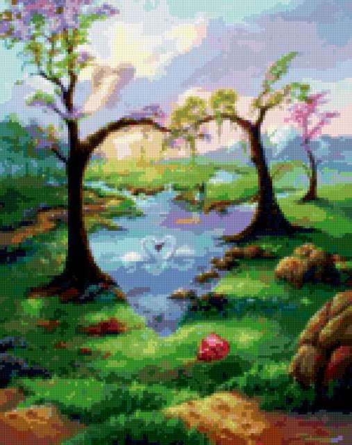 Ориентировочно так, схема вышивки «Деревья любви», созданная автором Svetla_Nochka, будет выглядеть при отшиве на канве. Размер данной вышивки равен 150x189 крестов, при этом используется 84 цветов. Ключевые слова, по которым можно найти эту схему: деревья, природа, любовь, красота, романтика, нежность. Также, вы можете взглянуть на оригинальную картинку, соответствующую данной схеме вышивки.
