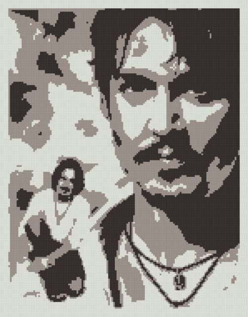 Ориентировочно так, схема вышивки «Джонни депп 1», созданная автором ufktxrf, будет выглядеть при отшиве на канве. Размер данной вышивки равен 149x190 крестов, при этом используется 3 цветов. Ключевые слова, по которым можно найти эту схему: джонни депп, артист, джек воробей, пират, чёрно-белый, монохром. Также, вы можете взглянуть на оригинальную картинку, соответствующую данной схеме вышивки.
