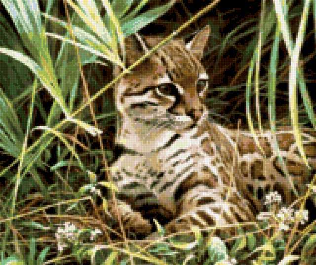 Ориентировочно так, схема вышивки «Дикий кот в зарослях», созданная автором rybka6, будет выглядеть при отшиве на канве. Размер данной вышивки равен 190x160 крестов, при этом используется 58 цветов. Ключевые слова, по которым можно найти эту схему: животные, хищные, звери, кошка, дикая, заросли, лесные. Также, вы можете взглянуть на оригинальную картинку, соответствующую данной схеме вышивки.